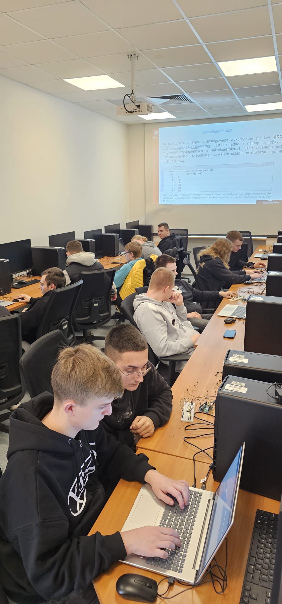 W dniu 26.02.2026 roku grupa 30 uczniów z klas 3PTP, 5PEI, 5PRF, 5PTI, 5PTP oraz 5PTŻ wzięli udział w warsztatach z programowania Arduino na Politechnice Wrocławskiej we Wrocławiu. Prowadzący zajęcia w sposób interesujący wprowadzili młodzież w świat elektroniki, a dzięki sporej wiedzy z zakresu programowania naszych uczniów zajęcia mogły odbyć się bardzo sprawnie. Dziękujemy i do zobaczenia na kolejnych warsztatach!